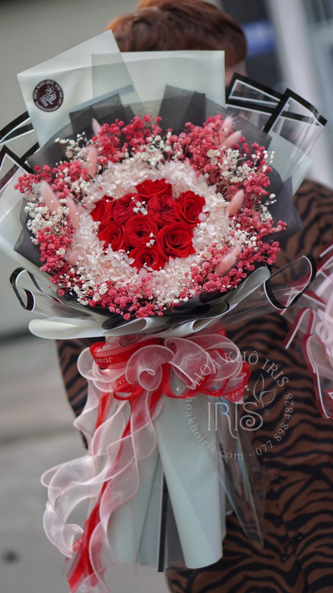 Bó hoa hồng đỏ gồm 99 hoa hồng kết hợp với giấy đen và bibi trắng cực kì sang trọng