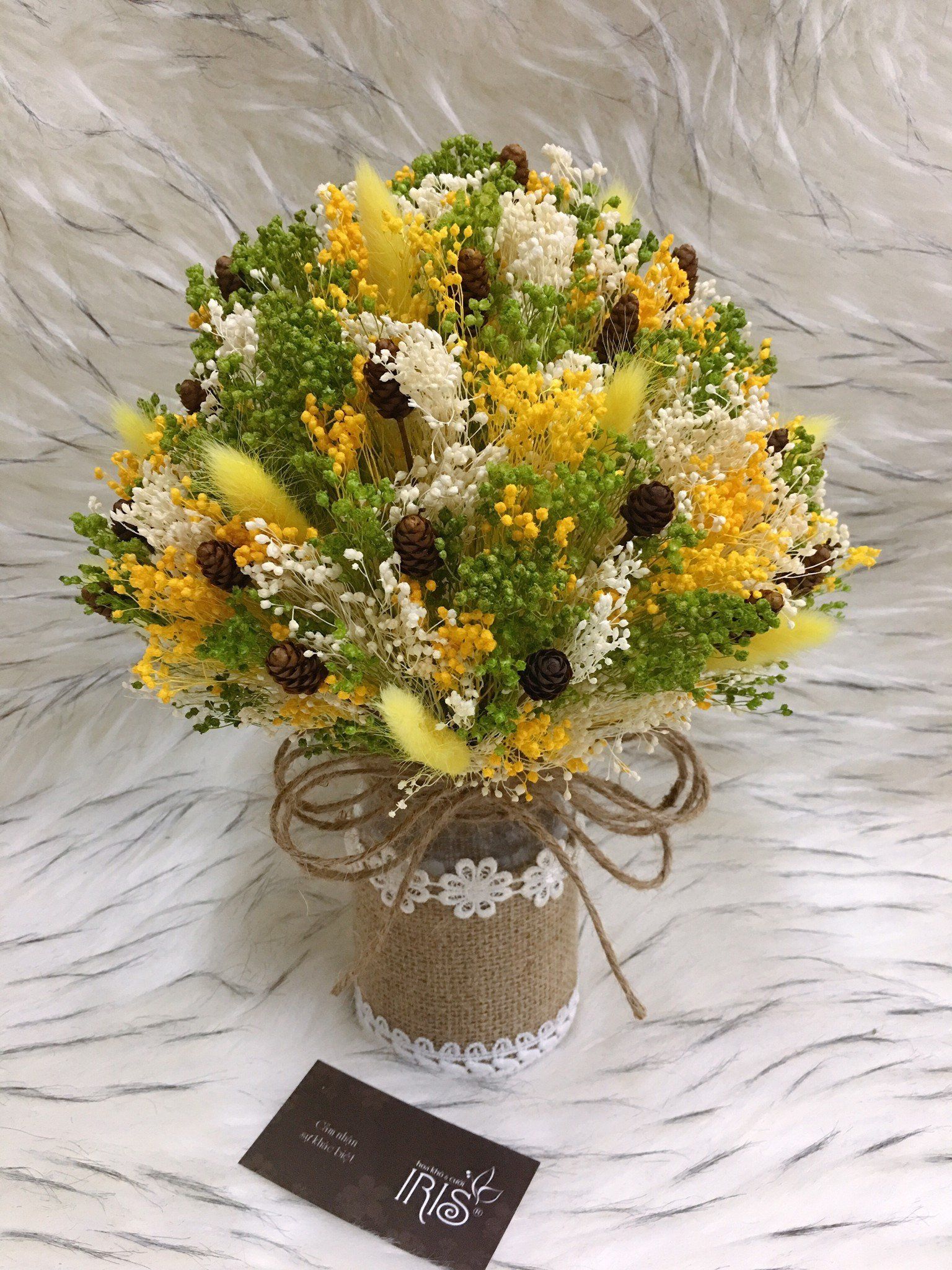 LỌ HOA BABY GROOM KẾT HỢP XANH , VÀNG , TRẮNG ĐIỂM ĐUÔI THỎ VÀNG VÀ DÙI TRỐNG