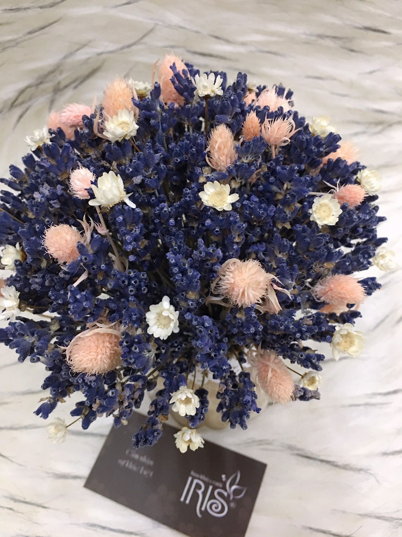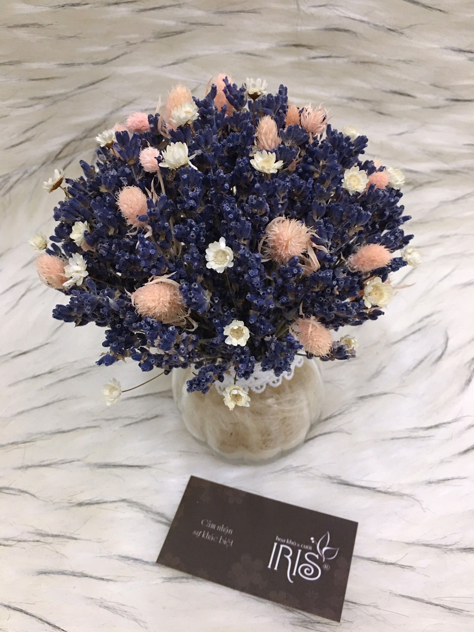 LỌ HOA LAVENDER ĐIỂM HOA NHÍM BIỂN VÀ GLIXIA TRẮNG