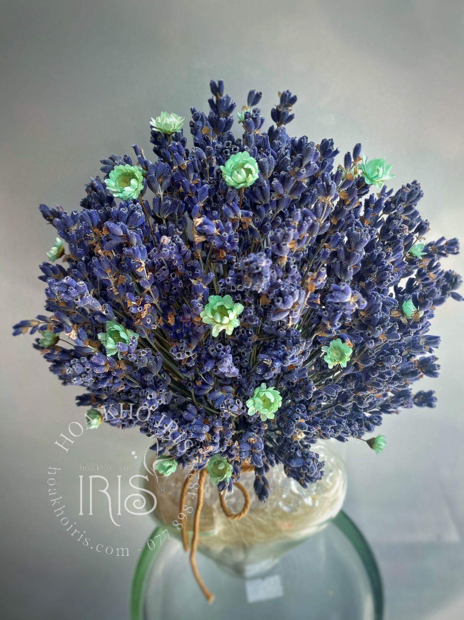 hoa glixia (tuyết nhiệt đới) là 1 trong những loại hoa khô có thể lưu giữ được rất lâu. bên cạnh đó màu ngọc của hoa kết hợp với màu xanh ánh tím của lavender đã tạo nên 1 lọ hoa lực đáng yê và thơm cực thơm