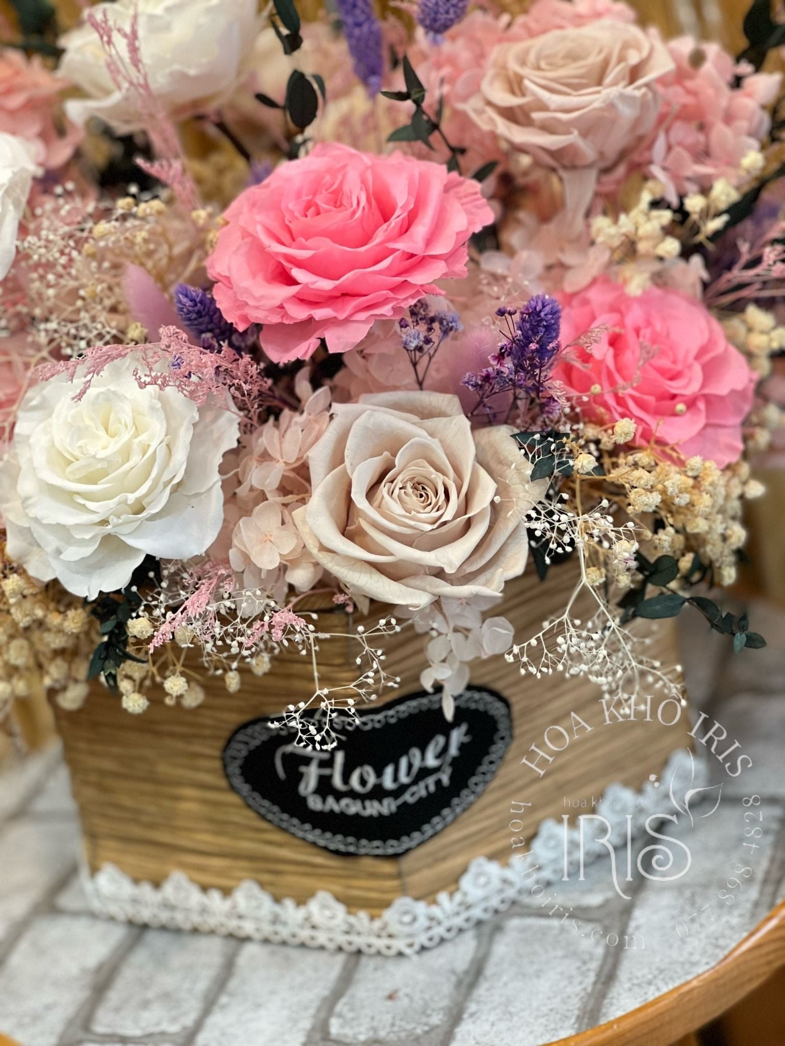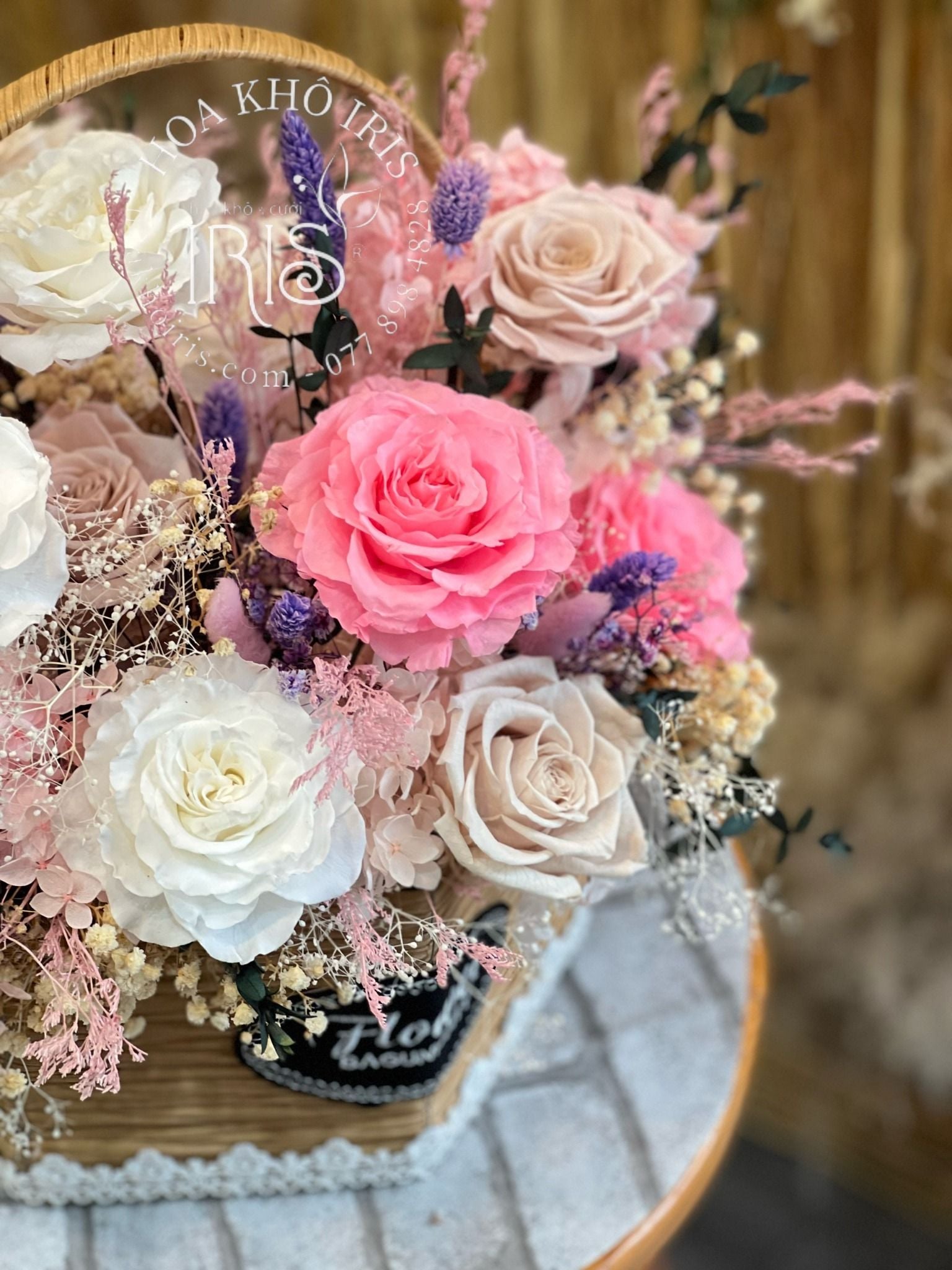giỏ hoa thiết kế tông màu nhẹ nhàng kết hợp giưc hồng và tím cực đáng yêu