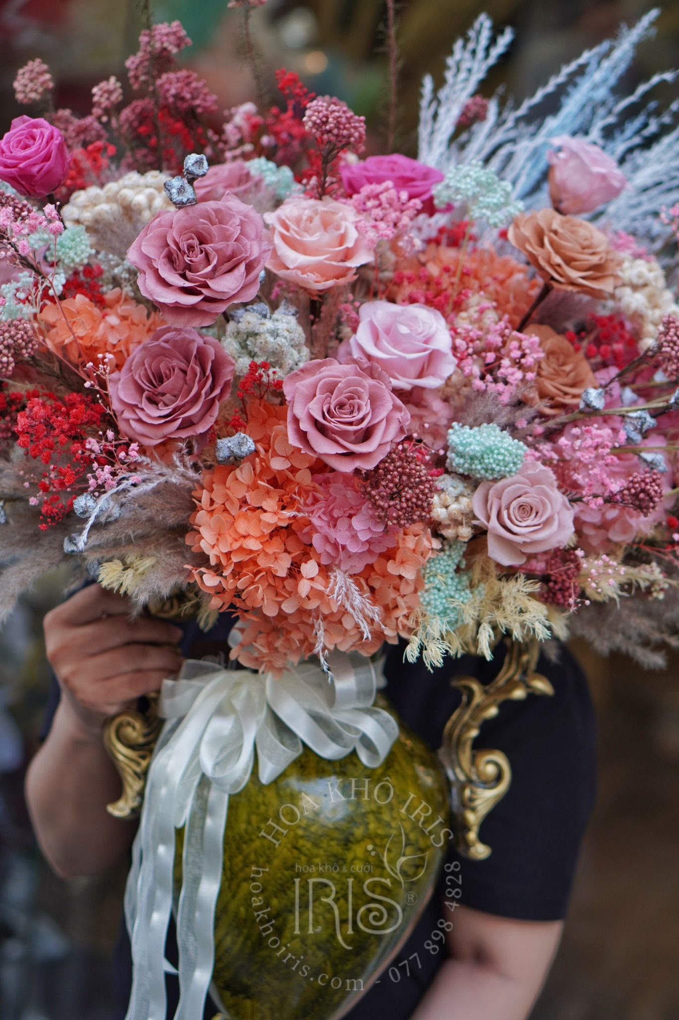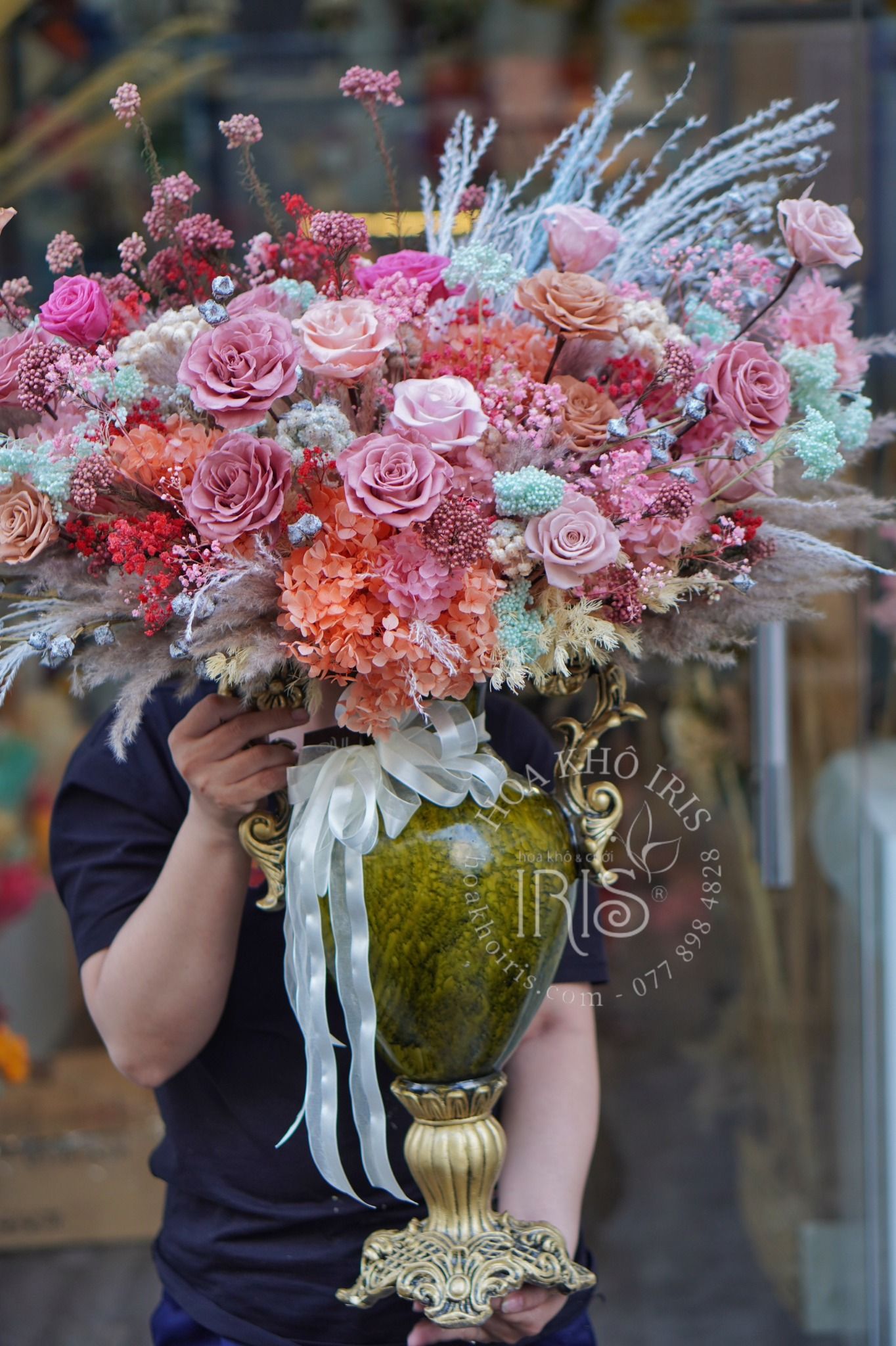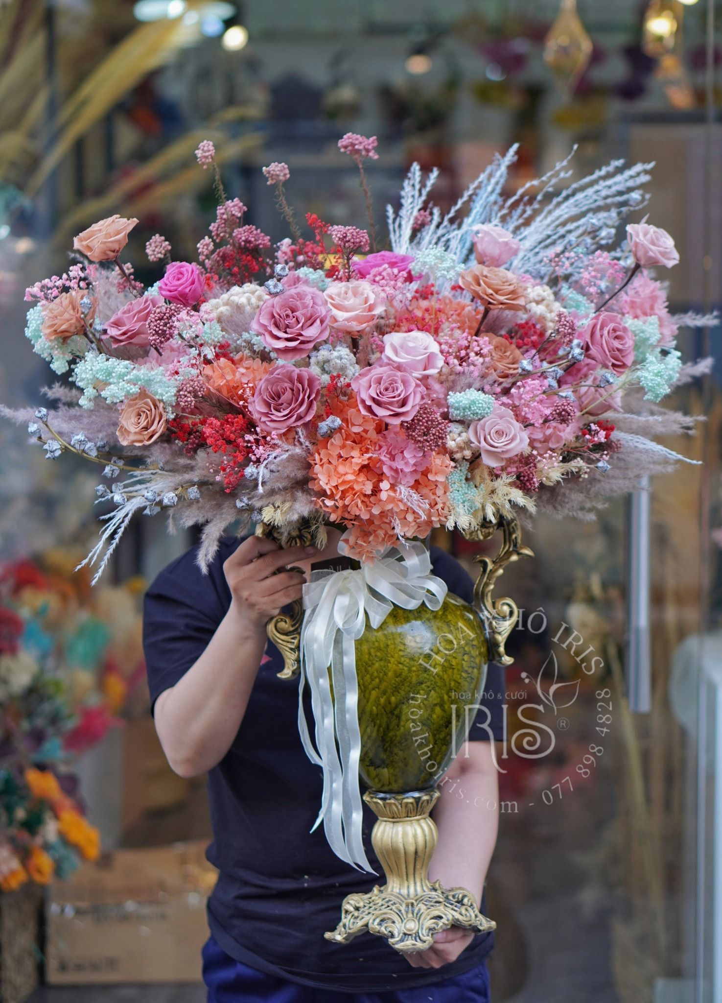 Với thiết kế nhẹ nhàng chậu hoa mang thương hiệu Hoa Khô IRIS tạo thêm điểm nhấn khá ấn tượng cho không gian nhà bạn