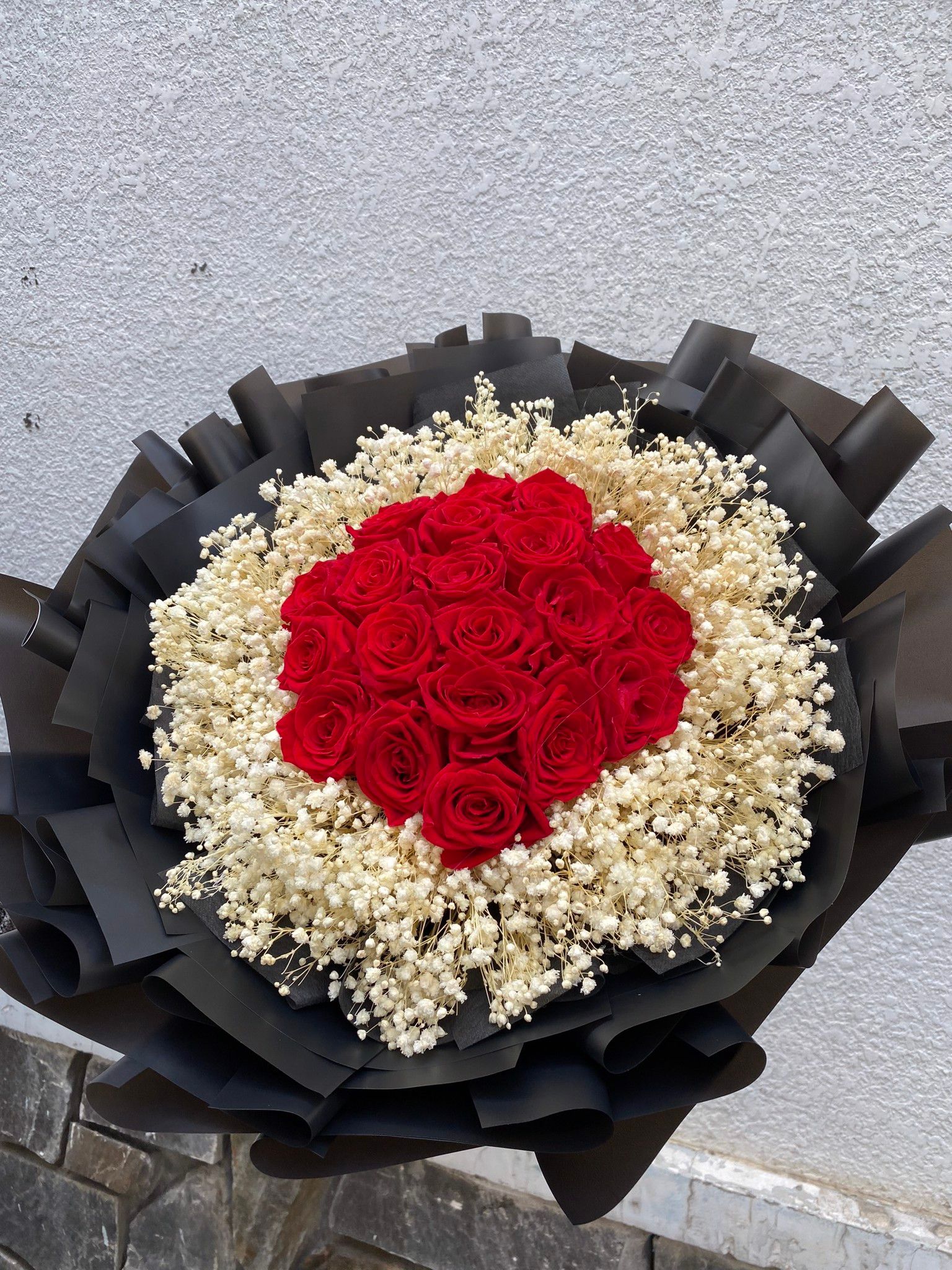 màu đỏ của hoa hồng là tình yêu bạn dành cho người ấy. màu trắng cảu bi bao phủ xung quanh là sự đơn giản mộc mạc nhưng rất chân thành