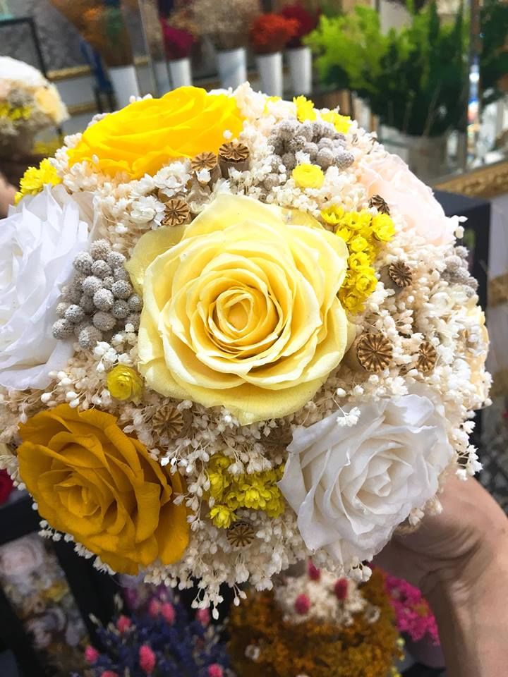 Hoa cưới cầm tay .Hoa hồng vàng kết hợp cùng với hoa Groom Bloom và các dòng hoa khô nhẹ nhàng tạo nên bó hoa cưới tông màu sunny cực yêu,. Xinh lắm các nàng dâu, chàng rễ nhé! Rất phù hợp cho các bạn lựa chọn.