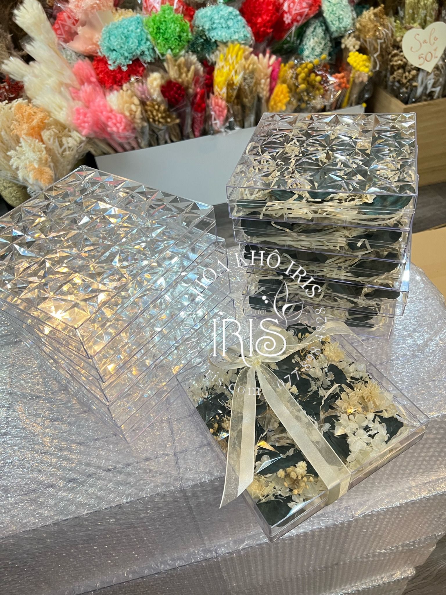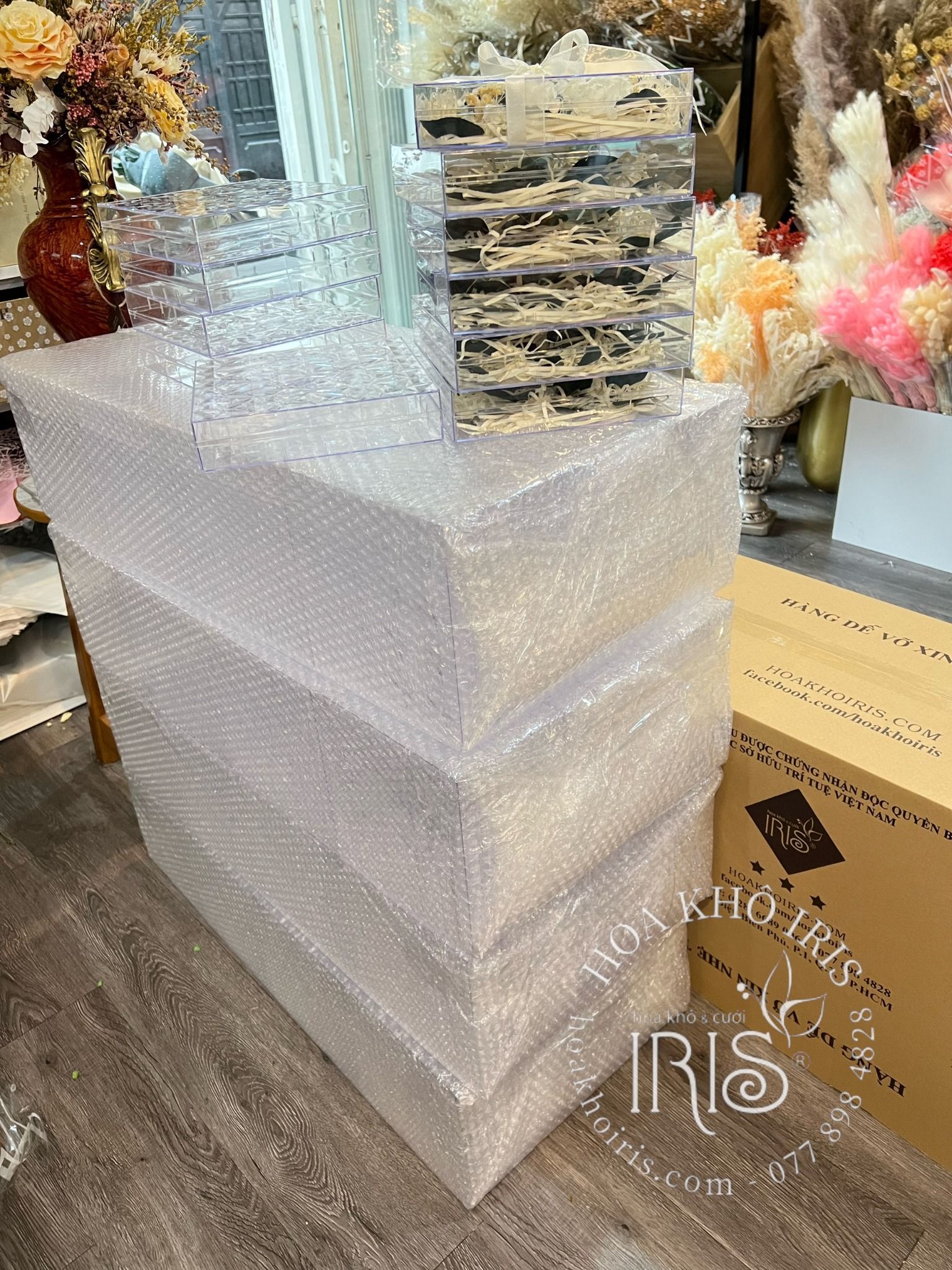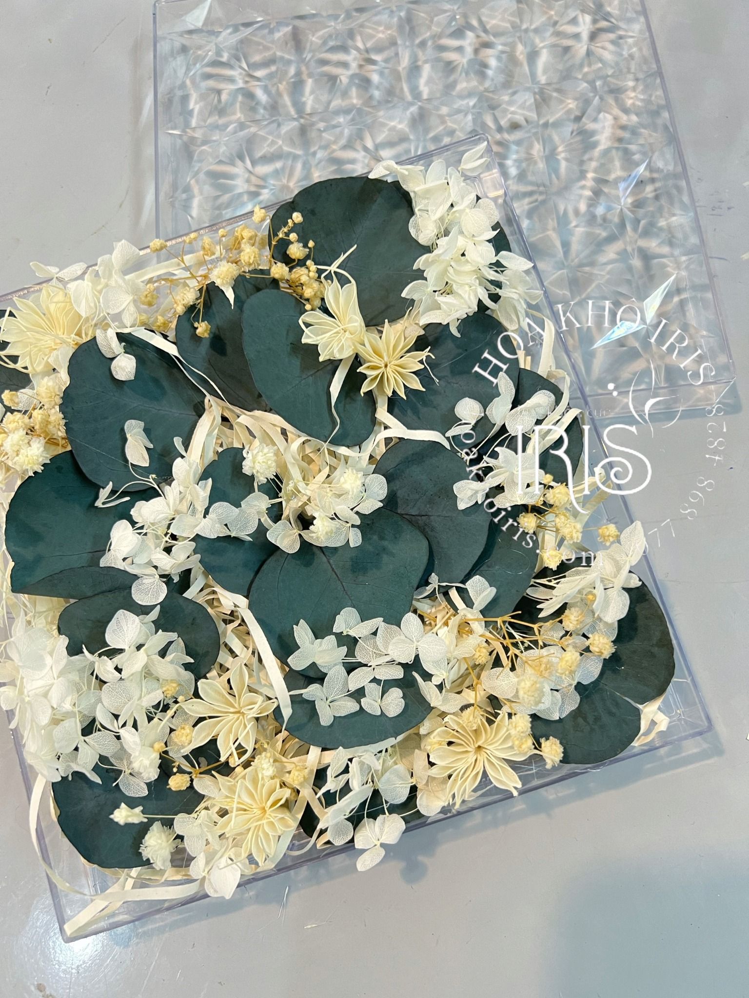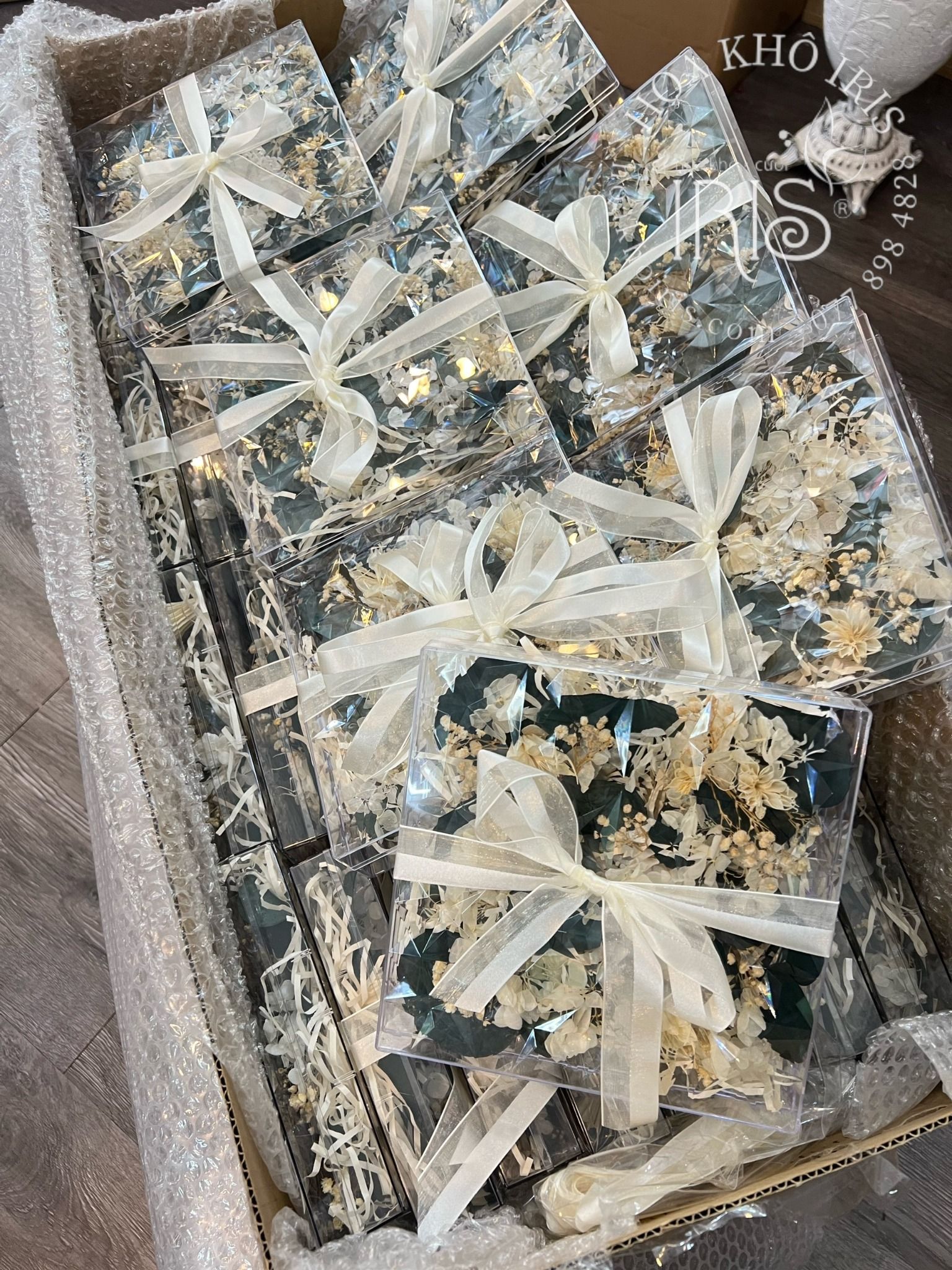 Hộp mica hoa khô đựng thiệp cưới, quà tặng