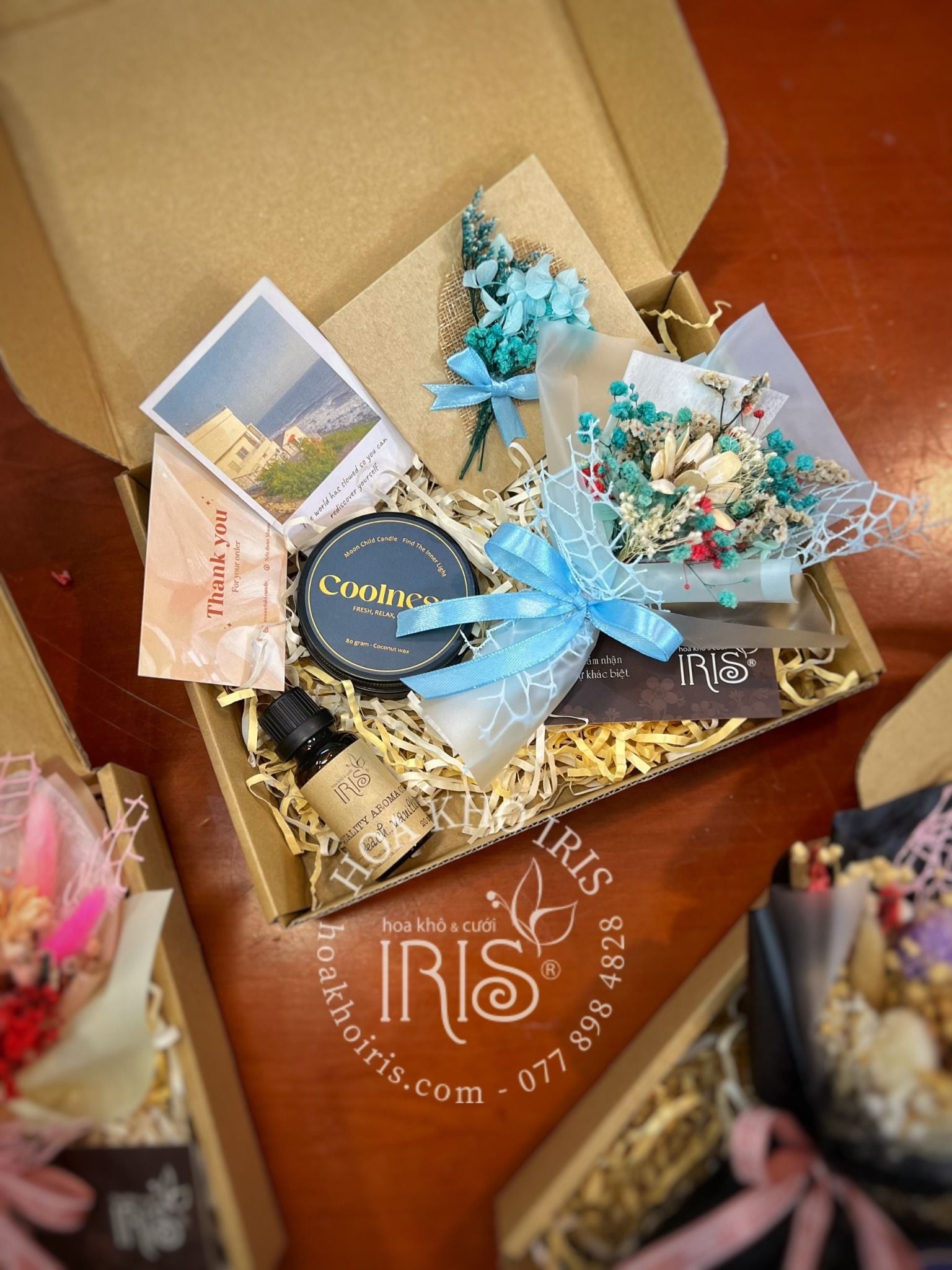 - Set 2: Nến thơm 2 hủ, bó hoa khô, lọ tinh dầu, thiệp hoa khô: 490k